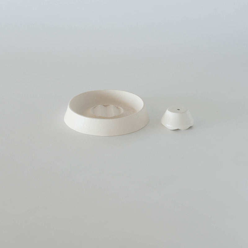 Two parts incense holder, upper parts fits into the lower dish. The top part can be used for stick and cone shaped incense, the lower part can be used for spiral incense.